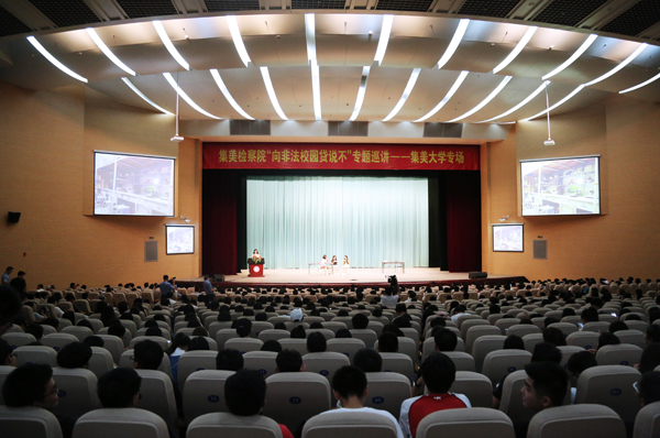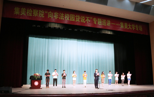 6月6日下午,由集美区人民检察院、集美文教区管委会主办的“向非法校园贷说不”专题巡讲活动在集美大学诚毅影剧院举行。厦门市检察院、集美区检察院、集美文教区管委会、集美侨英街道等单位领导及有关人员,集美大学校领导及1200余名师生代表参加了活动。华侨大学、厦门理工学院等辖区高校代表受邀参加。